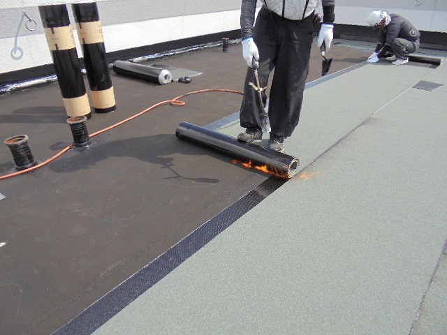 アスファルトシートの裏面をバーナーで溶かし溶着していきます。炙り具合を判断するのは非常に難しいですが、経験を積んだ熟練の職人さんによる作業で安心してお任せができます。