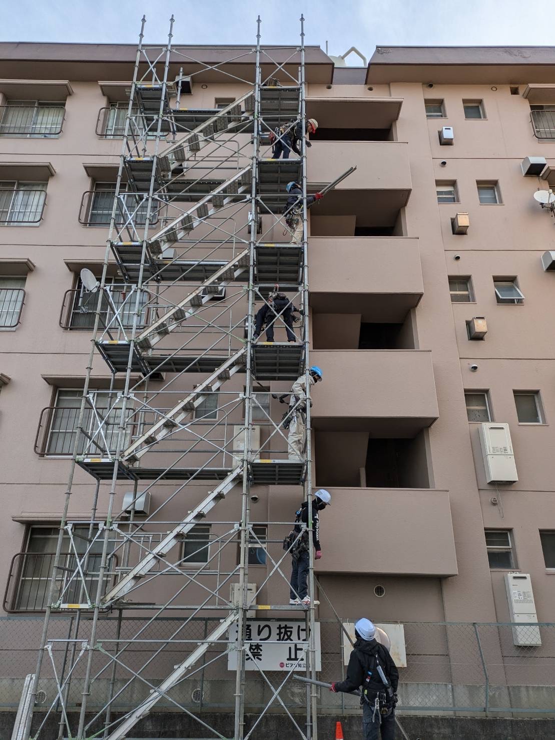 現在は、給水管新設工事に先立ち、外壁作業および高所作業に必要な外部足場の設置を行っています。足場設置にあたっては、第三者災害防止および作業員の安全確保を最優先とし、建物および居住者動線への影響に十分配慮した計画としています。